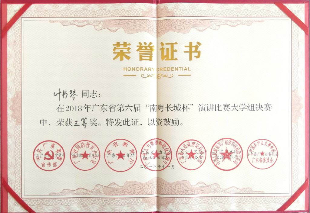 11月25号下午,以“传承红色基因,汇聚强军力量”为主题的广东省第六届“南粤长城杯”演讲比赛汇报演讲暨颁奖仪式在中山大学举行。我校人文学院17级语文教育专业崔小聪与叶书琴两位同学分别喜获二等奖和三等奖,我校首次荣获“优秀组织奖”。