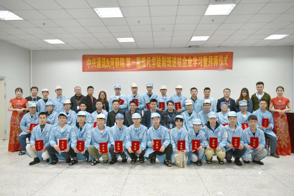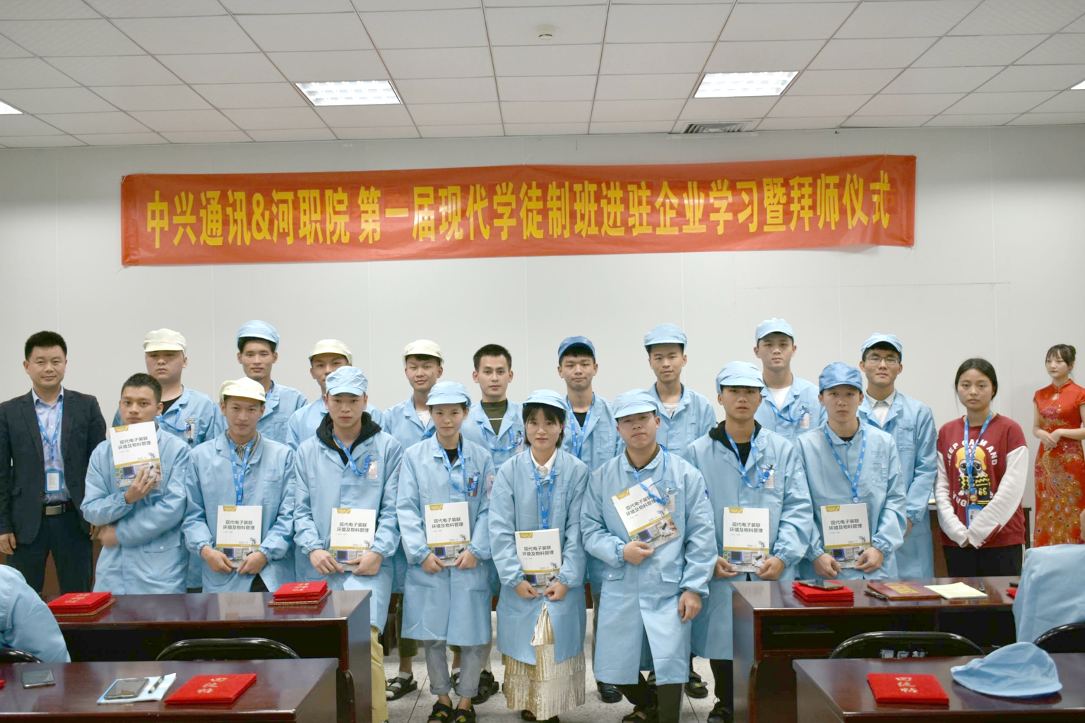 仪式上,周永福副院长对学徒制班基本情况做了介绍;杨黎院长为企业师傅颁发了聘书;在校企双方领导的见证下,“河职院&中兴通讯现代学徒制班”17名学生向11名中兴通讯的师傅行拜师礼、敬拜师茶,师徒双方签拜师贴、回徒贴,公司还为学徒进行了赠书。
