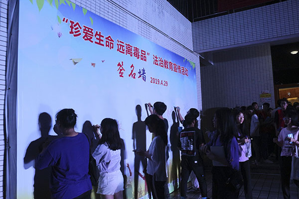 授课后,学生会主席李幕史同学上台进行庄严的禁毒领誓。随后,领导老师和师生代表们共同在禁毒宣传签名墙KT板上签名并有序参观毒品仿真品。活动在全体人员的合影留念中落下帷幕。