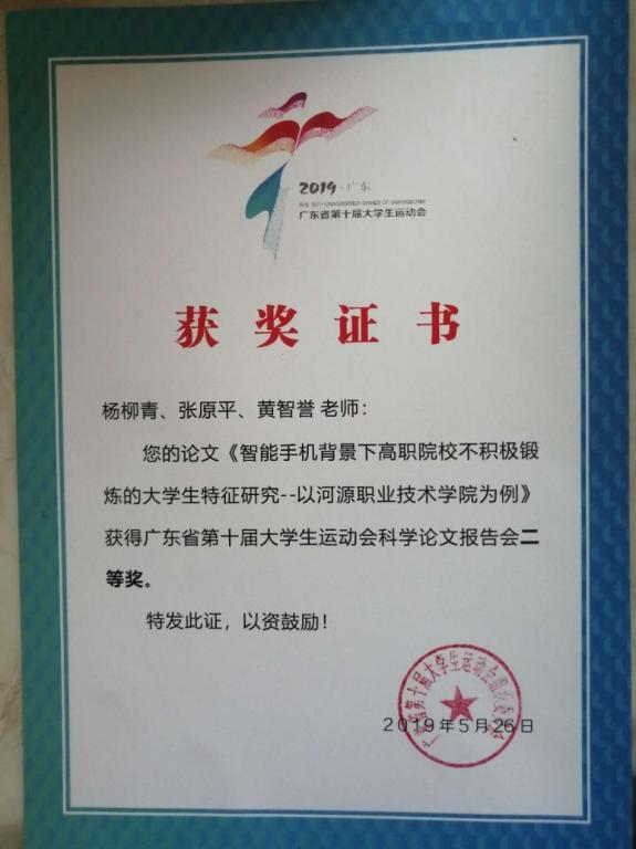 根据《广东省教育厅关于举办广东省第十届大学生运动会科学论文报告会的通知》(粤教体函﹝2019﹞4号)文件精神,我校体育教研室组织教师积极参与,共有11人撰写的22篇论文送审至由深圳大学承办的科报会。本届科报会共收到相关单位报送论文1377篇,获奖572篇(一等奖48篇,二等奖212篇,三等奖312篇)。经专家评审、查重和评审委员会确认,我校有3篇论文获奖,其中杨柳青老师的《智能手机背景下高职院校不积极锻炼的大学生特征研究——以必一手机登录入口为例》和《校园体育文化的特色引领与建设路径研究》分别获得二、三等奖,殷国龙老师的《论散打侧踹腿技术训练及运用》获三等奖。同时,杨柳青老师获邀参加了此次科报会,就获得二等奖的论文进行了汇报和答辩,与全省体育同行们对高校体育教育等方面进行了深入细致的研讨。