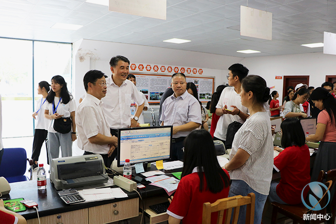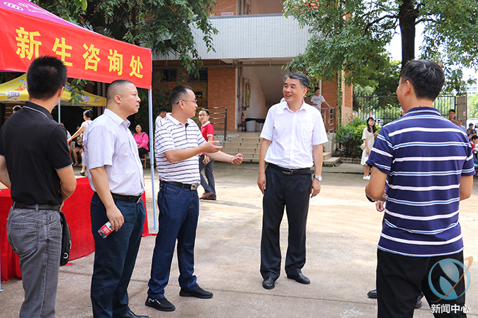 上午9时,我校党委书记韦荣、校长陈德清等领导走访各迎新报到点,看望慰问新生和家长。在走访过程中,学校领导逐一深入各二级学院迎新工作点,详细询问各个学院的报到情况,听取各个二级学院的迎新工作汇报。