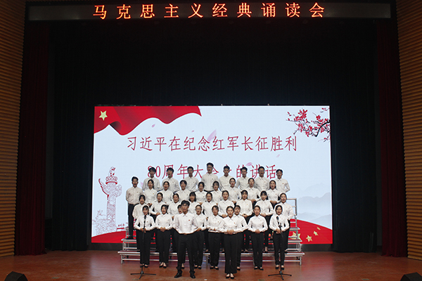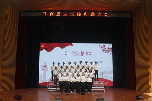 在诵读会中,各组学员以整洁的着装、饱满的精神轮番上阵,伴着婉转的旋律和铿锵有力的节拍,声情并茂地朗诵了《十九大报告》节选、《在纪念马克思诞辰200周年大会上的讲话》、《习近平在北京大学师生座谈会上的讲话》、《在纪念五四运动100周年大会上的讲话》、《习近平在纪念红军长征胜利80周年大会上的重要讲话》、《青年运动的方向》、《反杜林论》、《全体中华儿女的共同向往》等经典名篇。