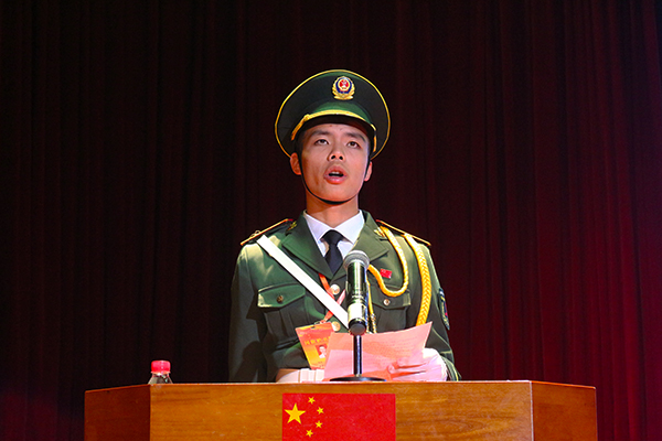 活动伊始,全体人员观看2018级国旗护卫队活动回顾及2019级国旗护卫队筹建情况视频。在团委陈晓峰书记上台宣读《关于成立2019级国旗护卫队及机构设置的决定》之后,主持人宣布2019级国旗护卫队成立典礼正式开始。伴随着庄严肃穆的国歌,典礼进入授旗、授臂章仪式,韦荣书记、陈德清校长以及赖小景副校长分别为大队长、教导员、副大队长颁授国旗、校旗、队旗。黄建华处长、赖新优部长、汤剑冰主任与欧阳玉娟处长先后为队员授予臂章。随后,国旗护卫队全体成员在国旗下郑重宣誓:“以我火红青春谱写国旗礼赞,用我生命热忱捍卫国旗尊严。”