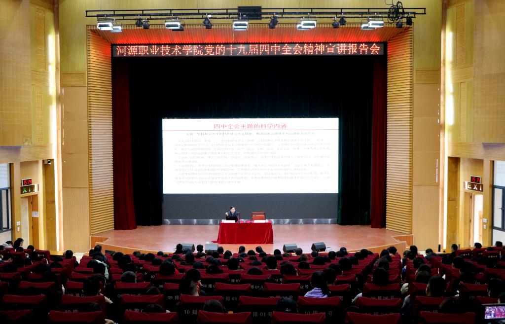 为了更好地学习宣传贯彻党的十九届四中全会精神,我校开展了以“以坚定的制度自信开辟中国之治新境界”为主题的报告会。大会上,韦荣书记围绕着“十九届四中全会的重大意义”“中国特色社会主义制度和国家治理体系的显著优势”“准确把握总体要求、总体目标和重点任务”“加强党的领导全面落实各项目标任务”四个方面进行讲解。韦荣书记强调,党的十九届四中全会是一次具有开创性、里程碑意义的会议,这次全会深入回答了在我国国家制度和国家治理体系上“坚持和巩固什么、完善和发展什么”这个重大政治问题。