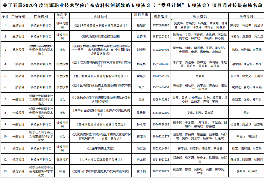 据悉,本次评审会评委共选出十三个项目,其中选定十份,三份候选项目。选定项目中《基于ROS的智能网联轮式移动底盘设计》、《现代酒店智能集成控制系统》、《美丽乡村建设中农村生活垃圾治理问题研究——基于广 东省河源市省定38个贫困村的调研数据分析》为重点项目,《基于双光谱切换技术的掌纹掌脉智能门禁系统》、《基于物联网和云服务的智能锁具的设计》、《基于区块链的食品安全追溯系统的研究与实现》、《文旅融合背景下河源研学旅游资源赋存及整合现状调研》、《基于GIS的河源非物质文化遗产空间结构探析》、《森林消防巡检机器人的设计与实现》、《文化自信背景下河源地区非物质文化遗产保护机制探讨 ——以龙川县为例》为一般项目,候选项目有《儿童车内安全装置》、《大学生社会实践服务平台设计》、《龙川马灯舞的现代性危机与发展对策研究》。
