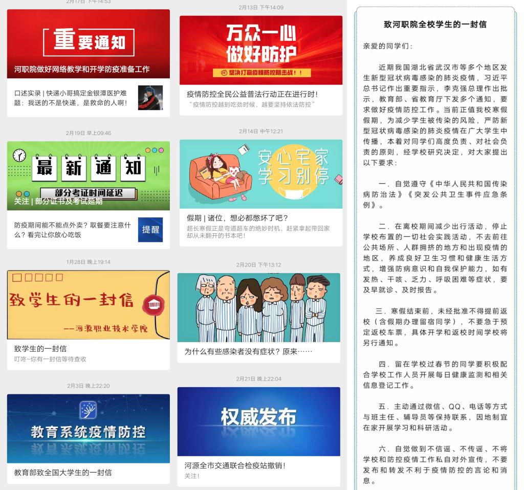 学校官方微信号1月28日发出《致河职院学生一封信》,号召全体学生立即行动起来,携手打赢疫情防控阻击战。《一封信》中号召全体学生要主动配合,积极参加防疫工作;理性认识,正确对待疫情信息;积极应对,倡导健康生活方式;珍惜时间,妥善安排工作学习。此外,学校官方微信平台陆续推出了《@河职学子 面对新型病毒,我们应该知道这些》《教育部致全国大学生的一封信》《假期|诸位,想必都憋坏了吧?》《洗衣机会传播病毒吗?手机要不要消毒?12个最新提醒请收好》等防疫推文。同时,我校官微和我校易班平台还推送人民日报、人民网、新闻网共70多篇防控疫情各类新闻信息。