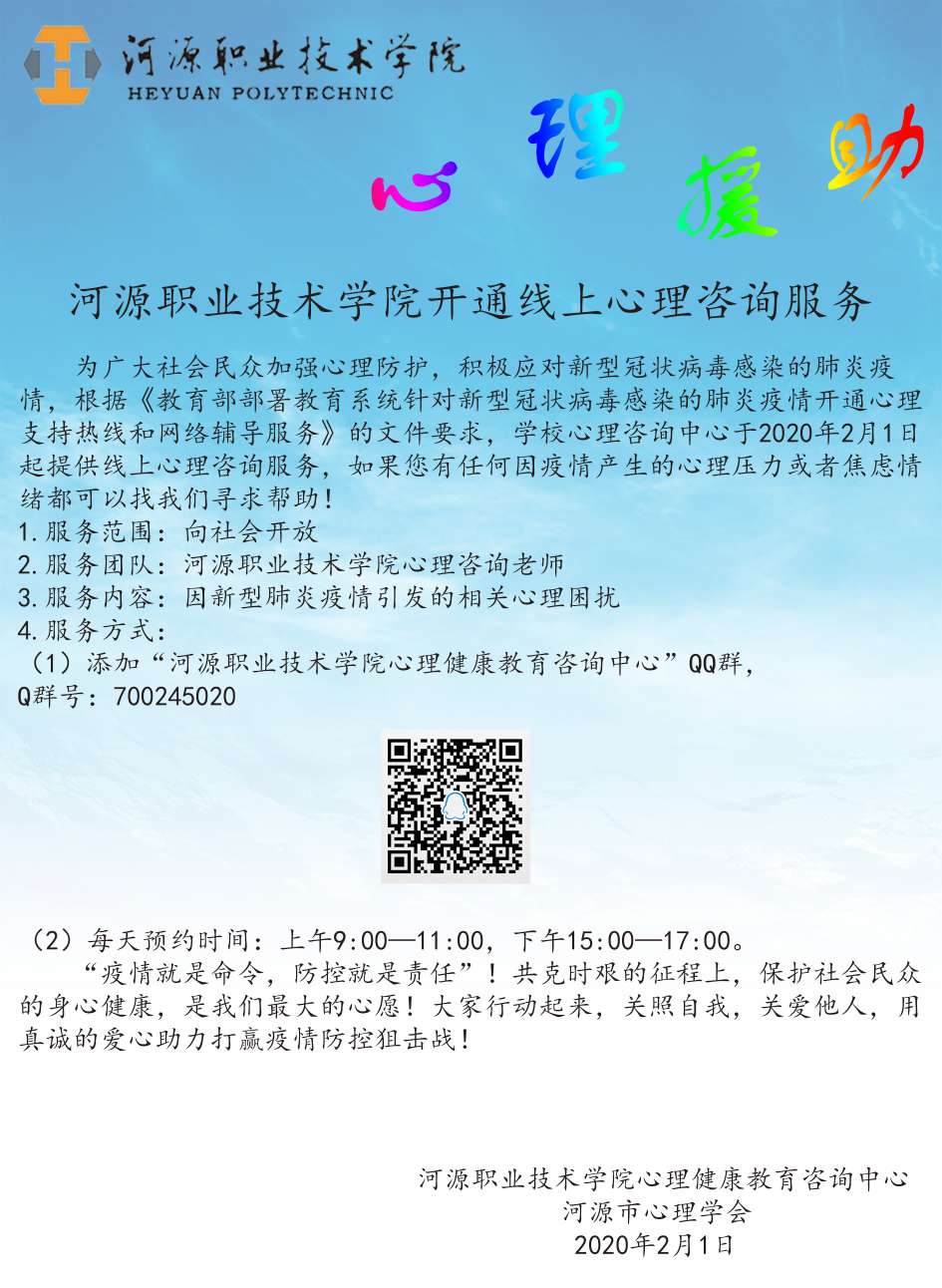 疫情发生后,必一手机登录入口学生工作处心理健康教育咨询中心为了确保我校的全体师生心理安全,中心主任钟碧来副教授于1月26日(大年初二)便启动了“线上心理咨询援助”,对全体师生开展疫情期间心理咨询援助服务。