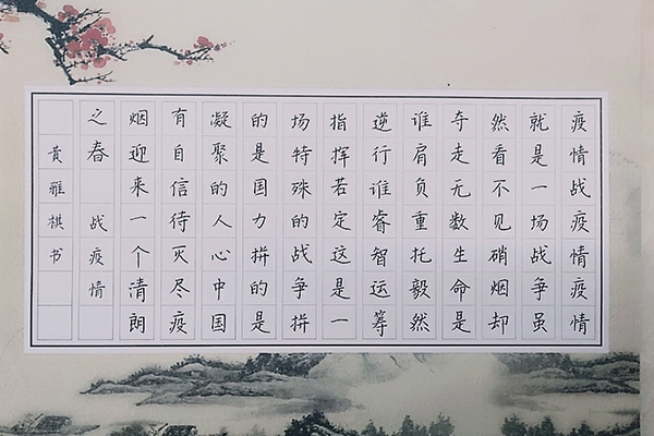 全体学生踊跃参与各项活动,向一线战“疫”英雄和白衣天使们致敬。学生们用心摘抄“习近平总书记对新型冠状病毒感染肺炎疫情系列重要指示”的硬笔作品,以骨气洞达,隽秀飘逸的字体表现出众志成城的家国情怀。在“为爱发声”抗击疫情朗诵活动中,作品《情牵武汉》富有韵味,声情并茂,与听众产生强烈共鸣,激发广大学子乐观向上的坚定信念。一首首激昂慷慨的诗歌《相拥在黎明破晓前》、《江城风雨》等作品震撼人心,用笔尖文字赞颂所有逆行者们的奉献精神。原创歌曲《不远春》唱出了对广大基层一线工作人员平安归来的期盼。