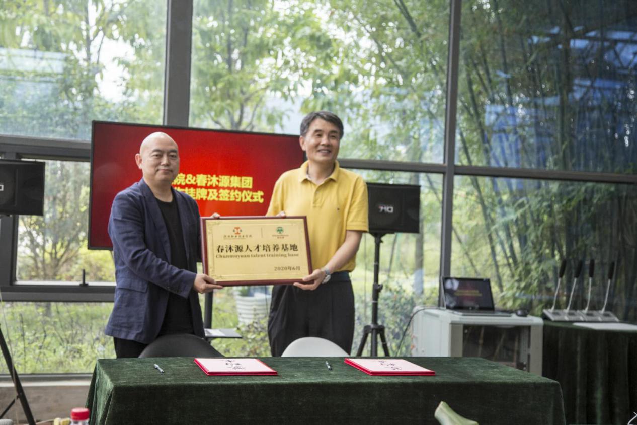 学校陈德清校长与春沐源郭德英总裁签署了校企合作协议,拉开了河职院&春沐源校企深度合作的第一步。郭德英总裁向陈德清校长授“春沐源人才培养基地”牌匾,这是一份沉甸甸的寄托和期望。全体与会人员见证了陈校长和郭总裁为“河职院实习就业基地”揭牌。