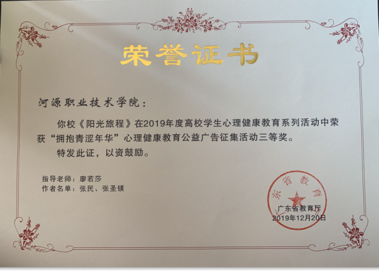 近日,广东省2019年度高校大学生心理健康教育系列活动评选结果揭晓,我校在心理漫画、主题演讲及公益广告三项活动中获奖。其中,艺术学院苏娜老师指导廖子琪同学的《梦想住在我身上》心理漫画获得二等奖,机电学院廖若莎老师指导张民、张圣镁同学的《阳光旅程》公益广告和机电学院赵雯钊老师指导钟琳琳同学的《少年中国志》主题演讲获得三等奖。