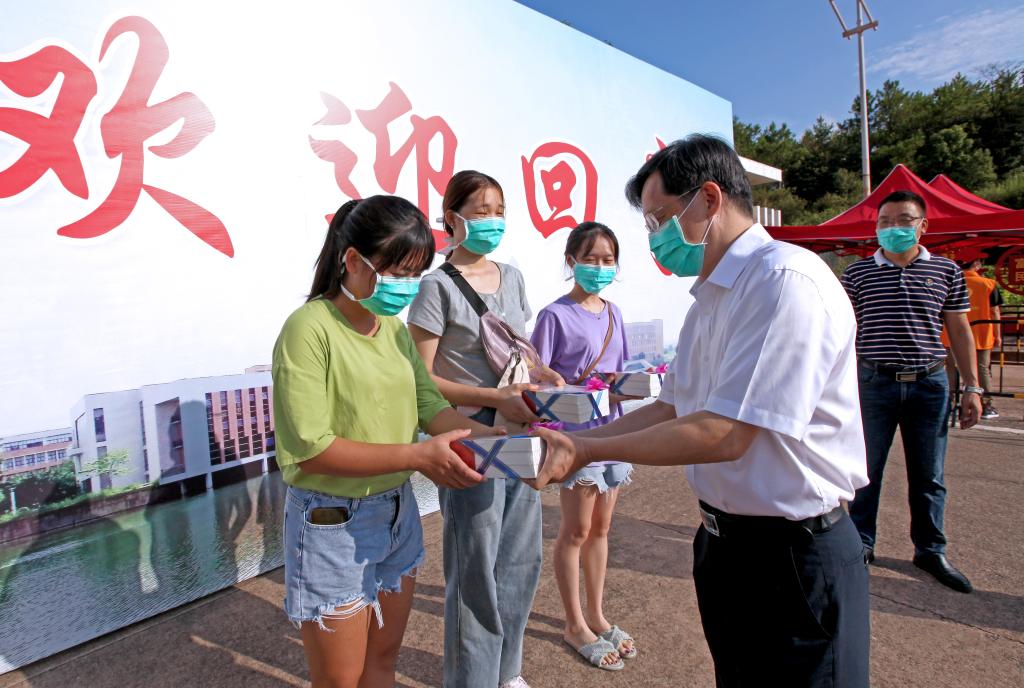 一大早,党委书记韦荣就来到学校东门,亲自迎接第一批返校学生,对阔别半年的学子们送上“欢迎回家”的祝福,并为前三名返校学生送上纪念品一一路遥的作品《平凡的世界》,勉励他们好好珍惜时间,努力学习,在平凡的日子里,做出不平凡的的成绩。校长陈德清及学校领导班子成员均到现场指导接待工作。