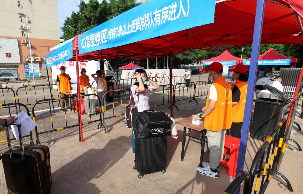 学生返校到达学校东门后,在工作人员指引下有序排队,依次经过扫码验证、行李消杀、更换口罩、体温检测、现场报道等环节后进入校园。
