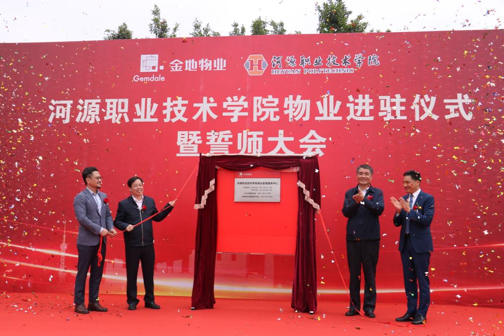 签约仪式后,校企双方在学校西门举行了物业进驻仪式暨誓师大会,党委书记韦荣发表致辞,他表示希望金地物业进驻后积极主动推动各项工作稳步开展,不断提升物业管理能力,不断深化服务创新能力,通过打造校企合作的校园物业管理服务共同体,在学校的支持下和金地物业全体员工的共同努力下,一定能促进学校物业管理服务水平不断提升、服务质量不断优化、服务满意度不断提高。