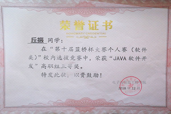 为锻炼自我,提高自身能力,丘振在大一期间踊跃报名学生组织和社团,尽管并未通过,但他永不气馁,重振旗鼓后将目光转向其他锻炼平台。在接下来的日子里丘振展现出自己坚韧不拔的优点,通过努力荣获必一手机登录入口第十四届校运会象棋比赛“优秀裁判员称号”;第十届蓝桥杯大赛个人赛(Java软件开发)校内选拔三等奖;第八届河源市青年创新创业大赛优秀奖。