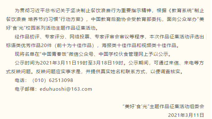为贯彻习近平总书记关于坚决制止餐饮浪费行为重要指示精神,根据《教育系统“制止餐饮浪费,培养节约习惯”行动方案》,本次活动由教育部主办,中国教育后勤协会承办。活动面向公众征集“美好‘食’光”主题参赛作品,共收到投稿作品4081件。经作品初评、专家评分、网络投票、专家评审会审议等程序,征集活动评选出标语类优秀作品20件(前十为十佳作品),海报类十佳作品和视频类十佳作品。我校与广东富德斯餐饮管理有限公司(廖远兵、何炳春、李兰芳、孙启兴、苏龙权)联合报送的视频作品脱颖而出,最终斩获“视频类十佳作品”奖项。