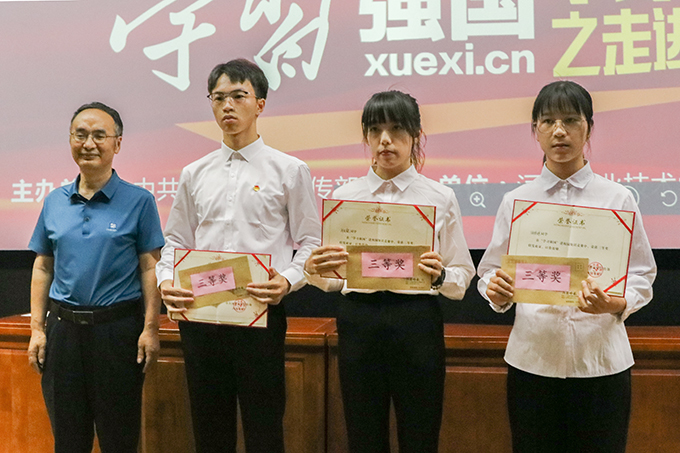 紧接着,进入到学习强国知识竞赛环节,12名参赛学生代表在10分钟之内答题挑战,决出一等奖1名,二等奖2名,三等奖3名。竞赛结束后,主持人与台下学生进行现场答题互动,学生观众们踊跃参加,积极抢答,现场气氛热烈。经过工作人员的精准计算,竞赛得分名次也随之公布,由刘烨洲副社长、副总编辑为三等奖颁发奖品及证书;由陈晓峰书记为二等奖颁发奖品及证书;由俞立峰科长为一等奖获得者颁发证书。最后,本次活动在出席领导、工作人员与学生代表的合影留念中落下帷幕。