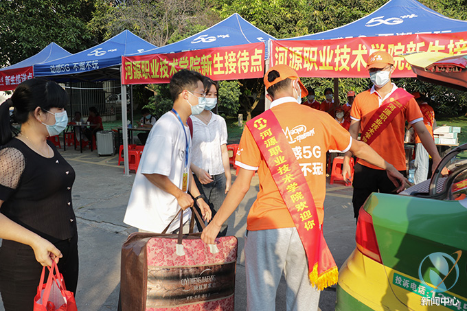 我校青年志愿者协会在新生出站后,第一时间热心上前为新生搬行李、引导新生到接待点休息,登记个人信息后安排车辆接送回学校。