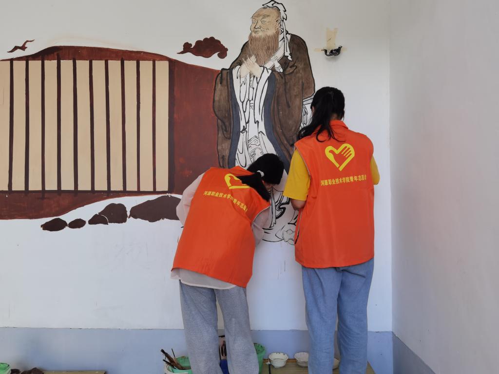 在紫金义合镇青水小学,墙绘志愿服务队队员共粉刷了7间教室以及两条楼梯、图书室外墙及校园内围墙约1000平方米,绘制了约150平方米的传统文化内容的墙绘。