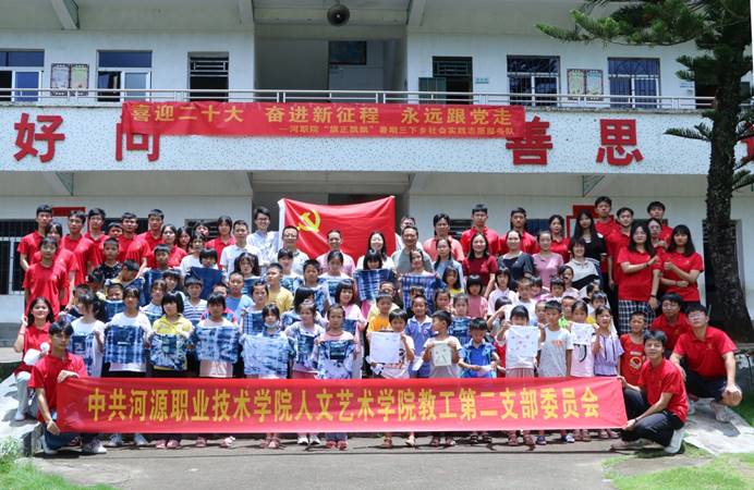 最后,人文艺术学院教工第二党支部的党员同志、“三下乡”志愿服务队的师生和瑶坑小学的师生一起合影留念。