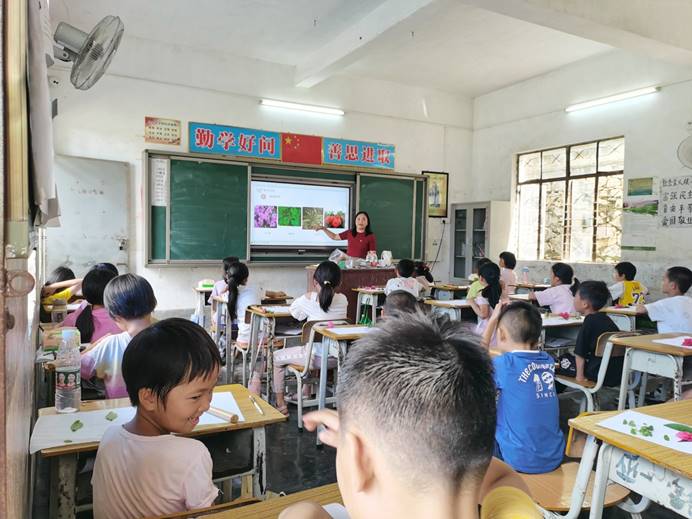 为了让瑶坑小学的同学们感受中国传统文化的魅力,培养热爱生活、热爱大自然的美学意识,帮助他们树立起传承发扬中华民族优秀传统文化的观念。7月8日上午,我校人文艺术学院教工第二党支部10名党员同志和“三下乡”志愿服务队一起,到赤光镇瑶坑小学开展了以“党建引领 传承发扬中华民族优秀传统文化”为主题的暑期专项活动,为瑶坑小学的学生们带来了两堂别开生面的美育实践课——植物拓染和墩头蓝织染技艺课。