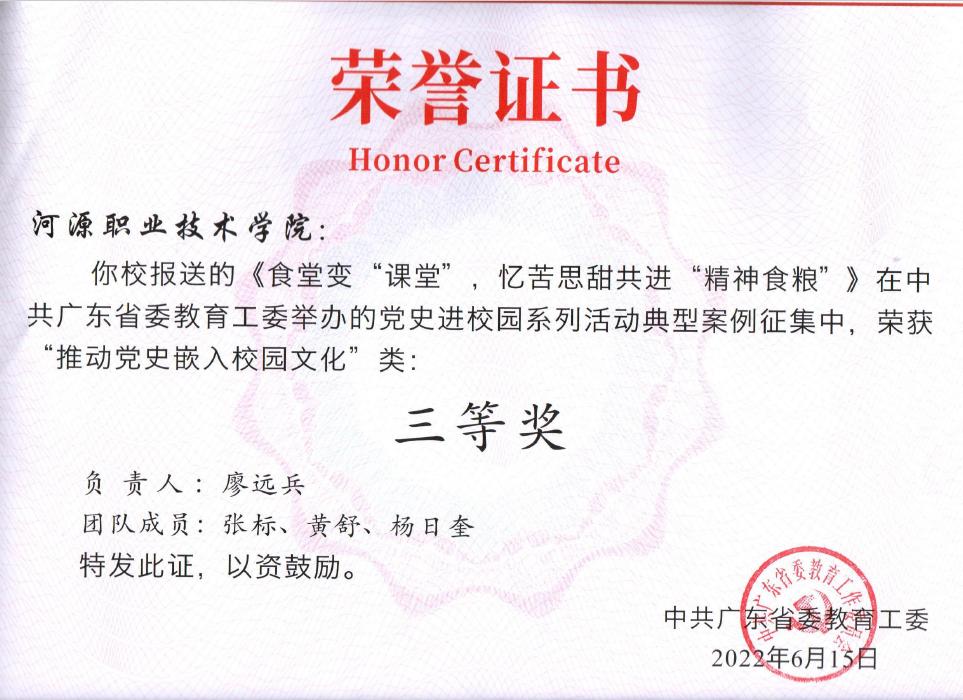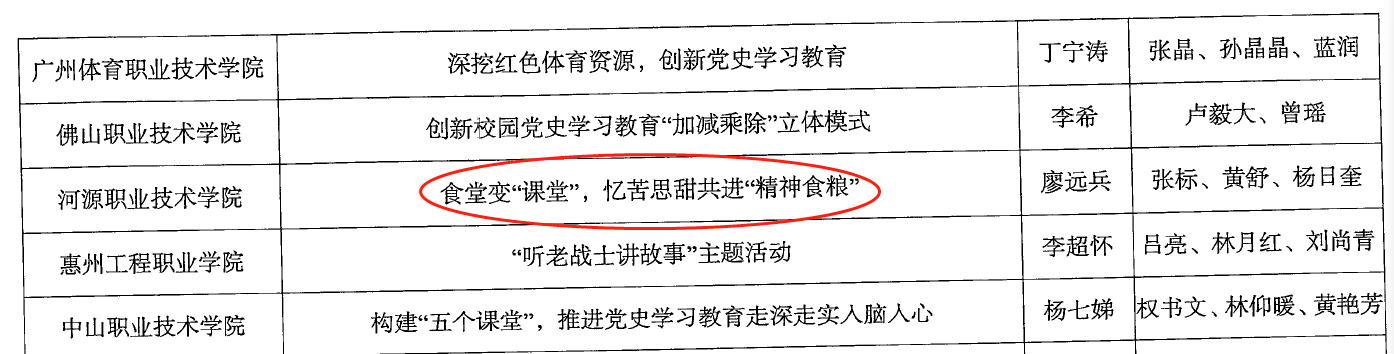 近期,中共广东省委教育工委公布“党史进校园系列活动”典型案例获奖名单,经学校党委推荐,我校廖远兵、张标、黄舒等同志申报的《食堂变“课堂”,忆苦思甜共进“精神食粮”》荣获“推动党史嵌入校园文化”类三等奖。
