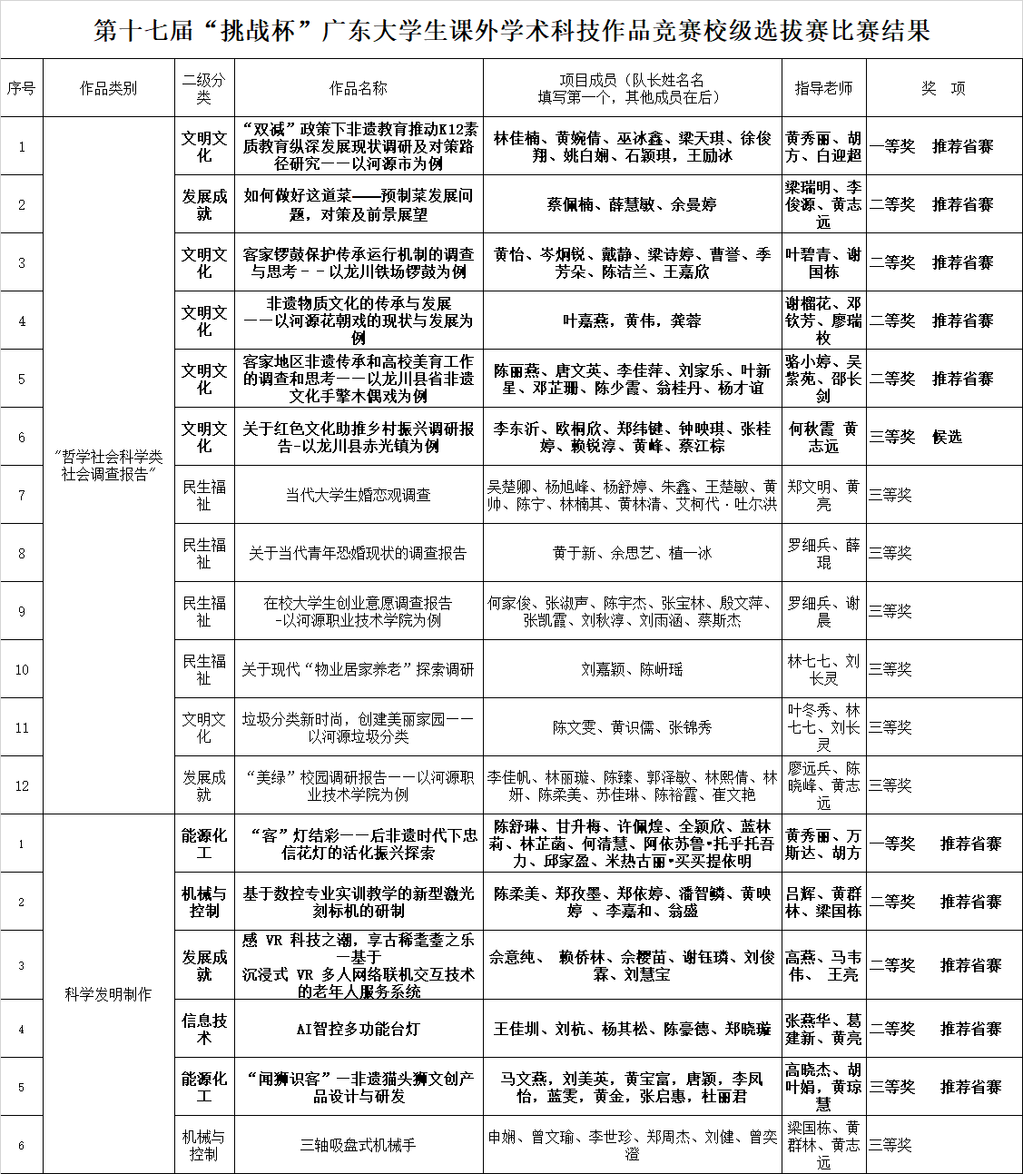本届“挑战杯”校赛分为A自然科学类学术论文、B哲学社会科学类社会调查报告和C科技发明制作三类。据了解,各学院共收集作品36份,经各二级学院遴选推荐,共选送18个项目进入校级评审。
