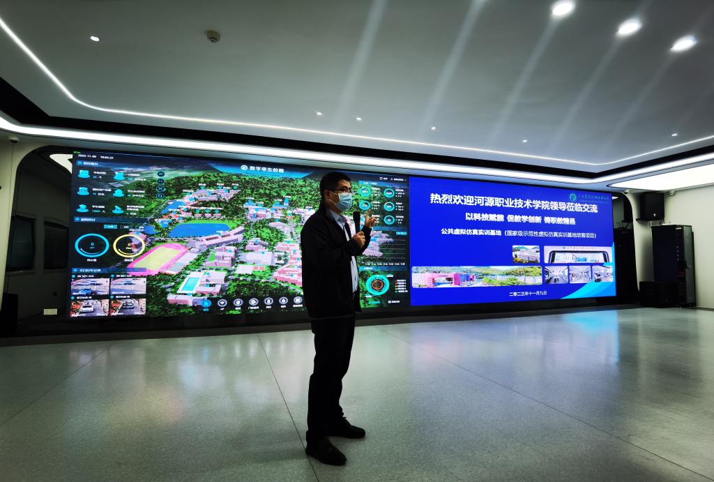 调研交流会上,李绍中介绍了公共虚拟仿真实训基地建设规划与资源应用、数据标准制定、大数据决策平台、数字孪生校园等整体建设情况。