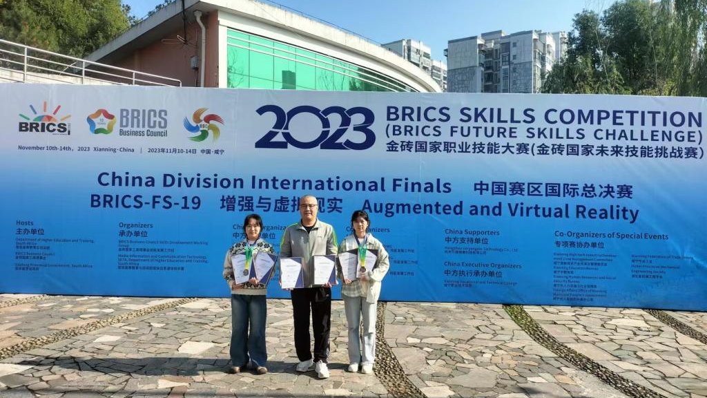 11月11日至14日,2023金砖国家职业技能大赛增强与虚拟现实赛项国际总决赛在湖北咸宁职业技术学院举行。来自全国各省市的37支职业院校参赛队同台竞技,我校模具设计与制造专业群派出的由刘俊英、梁丰两位老师及黄映婷、谭秋玲两位同学组成的参赛队代表广东省参加了比赛,经过激烈角逐,荣获全国二等奖的好成绩。刘俊英、梁丰两位老师被评为“优秀指导专家”。
