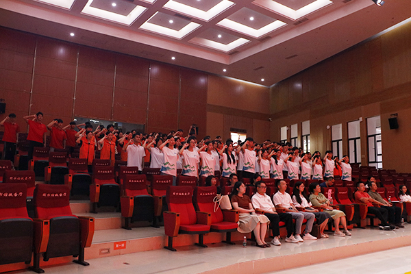 随后,姚家芳为实践团队代表授旗并宣布实践团队出征。指导教师代表黄秀丽、社会实践团队学生代表谢伊琼先后发言,杨旭辉同学带领现场所有实践团队成员进行集体宣誓。
