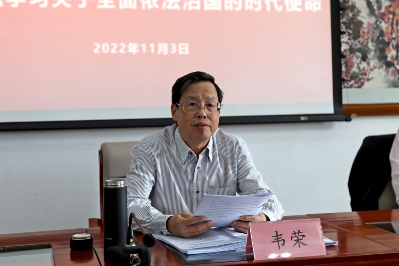 在全面推进依法治国的新时代背景下,我校党委理论学习中心组于11月3日召开专题学习会议,深入研讨全面依法治国的时代使命和实践要求。会议由校党委书记韦荣主持,党委理论学习中心组全体成员、各部门负责人参加学习。
