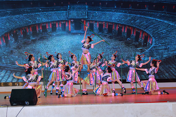大学生艺术团舞蹈队带来开场舞《奋进新时代》,透过历史的眼眸,用舞蹈向我们诠释一个日新月异、继往开来的新时代;叶潭镇半埔小学瑞狮团带来的《客家舞狮》,是我校三下乡校地合作的成果,向观众展现了富有魅力的客家文化;我校师生深入畲族地区采风创作而成的民族特色舞蹈《畲乡欢歌》,将畲族文化用欢快的舞步和乐曲呈现在观众眼中;周艳妮老师以一曲《多彩万绿湖》,带观众领略四季皆绿,处处皆绿的万绿湖;由花朝戏协会带来的《血田英魂》选场“盼光明”,用客家独特的演绎风格,展现出革命英雄的热血奋斗,让观众们充分感受到了非物质文化遗产的魅力。