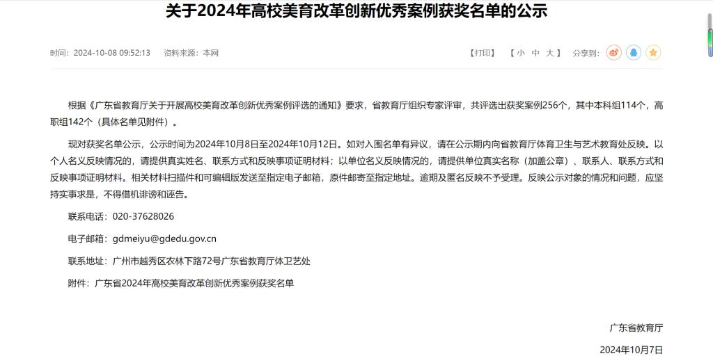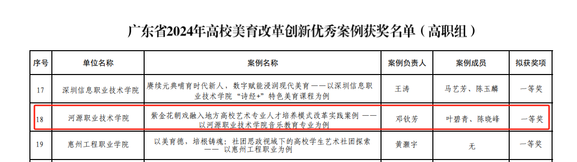 近日,广东省教育厅公布了2024年高校美育改革创新优秀案例的评选结果,共评选出获奖案例256个,其中本科组114个,高职组142个,我校推送的美育改革案例《紫金花朝戏融入地方高校艺术专业人才培养模式改革实践案例——以必一手机登录入口音乐教育专业为例》获高职组一等奖。