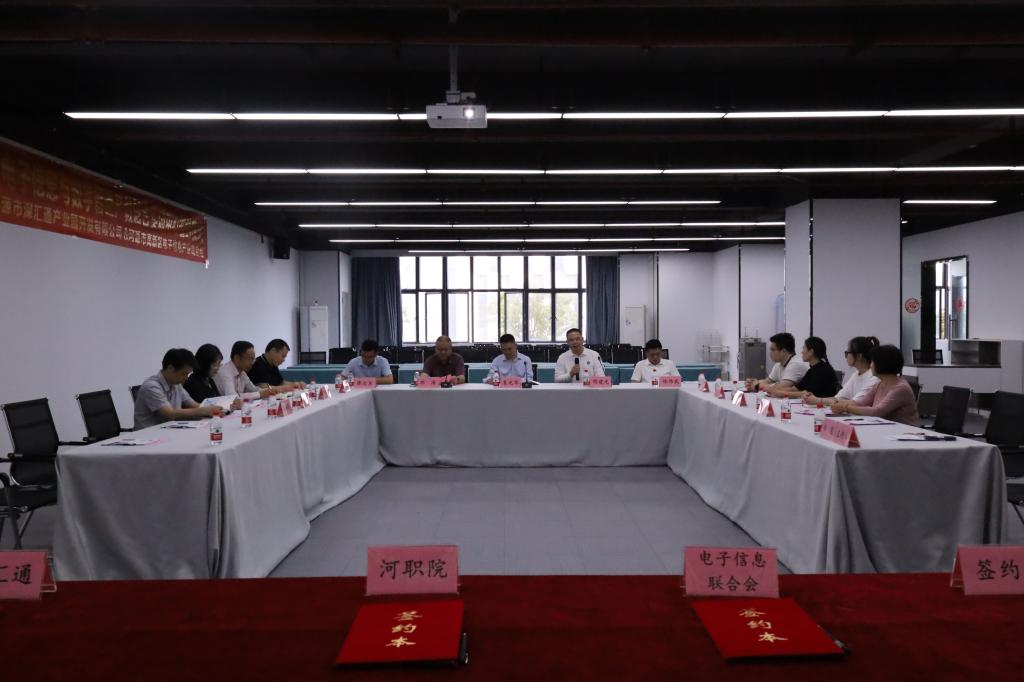 签约仪式上,校企会三方围绕项目下阶段工作开展了座谈交流。我校袁光华副校长表示,校企会三方要共同发力,共同构建产教融合、工学结合、知行合一的协同育人机制,促进教育链、人才链与产业链、创新链的深度融合。河源深汇通胡建光董事长表示,河源深汇通是深圳南山区国资委区属国企深汇通投资控股有限公司的全资子公司,肩负着探索深河特别合作发展新模式的重要使命,深汇通将对标产业发展前沿,多渠道筹措资金,建设集实践教学、社会培训、真实生产和技术服务功能为一体的开放型区域产教融合实训中心,积极助力以教促产、以产助教、产教融合、产学合作,为河源培养更多电子信息产业集群所需的技能型人才。河源市电子信息联合会邓涛会长表示,要将企业文化、企业先进发展理念及先进的工艺流程引入学校,把中心运营好管理好,构建集教学、生产、培训、技改于一体的产教融合实训中心,发挥基地的最大价值,提高人才培养质量。与会人员就实训中心的推进建设分享了经验,并提出了建设性意见。