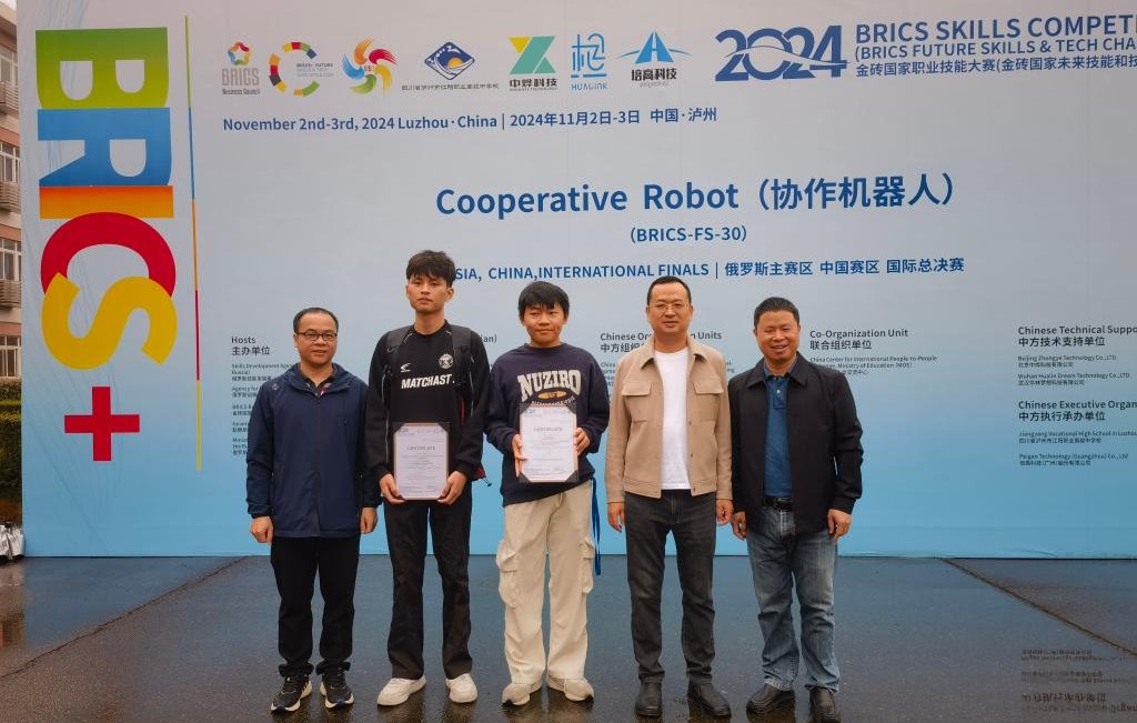 11月1日至4日,2024年金砖国家职业技能大赛(金砖国家未来技能和技术挑战赛)全国总决赛协作机器人赛项在四川省泸州市举行。本赛项汇聚了来自全国20多个省市的中高职院校、本科院校师生共计35支队伍70余名选手同台竞技。经过激烈角逐,我校机电工程学院黄文汉、钟建坤老师指导的学生黄培锋、刘文强荣获全国二等奖。