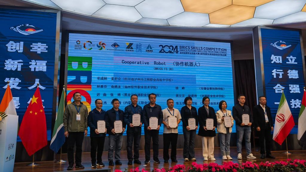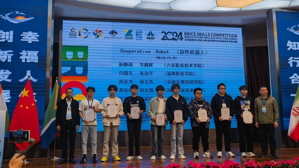 2024年金砖国家职业技能大赛由俄罗斯技能发展署、俄罗斯战略倡议署、金砖国家工商理事会等主办,协作机器人赛项为双人赛,总时长为3小时,包括协作机器人理论知识、机器人安装与绘图、电机底座分拣及装配和视觉配合下的俄罗斯方块叠加等4个项目,通过比赛提高了学生的协作机器人操作编程、安装调试和视觉应用能力。