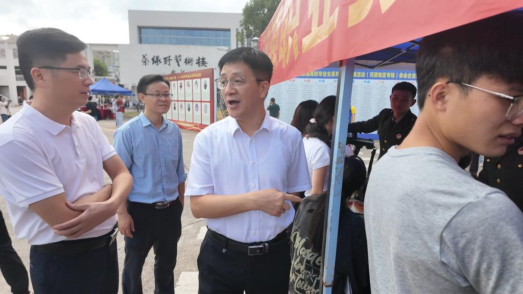 为响应国家号召,鼓励大学生积极参军入伍,11月14日,在河源军分区动员处的指导下,我校武装部组织强有力的征兵宣传工作队,深入由我校举办的“广东省2025届普通高校毕业生系列供需见面会(河源地区专场)”一线,广泛开展征兵宣传咨询活动,鼓励毕业生积极报名应征。学校党委书记韦荣、校长刘贻新、党委副书记纪委书记钟茂开、副校长赖小景、河源军分区动员处庞兴盛副处长等领导到现场指导工作。