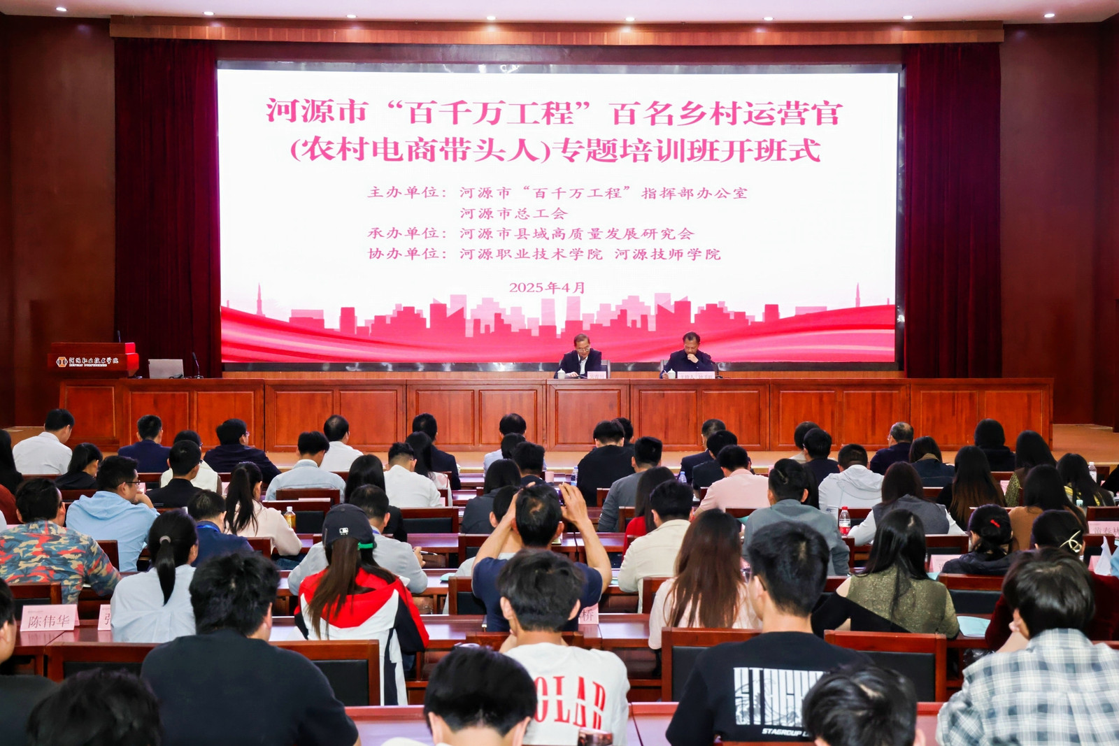 4月7日,河源市“百千万工程”百名乡村运营官(农村电商带头人)专题培训班开班式在我校学术交流中心报告厅举行。培训班由河源市“百千万工程”指挥部办公室与总工会主办、河源市县域高质量发展研究会承办、必一手机登录入口与河源技师学院协办,市委副书记吴青川,我校校长刘贻新,市总工会常务副主席黄远程,市“百千万工程”指挥办、市人社局、市农业农村局、市商务局、市文广旅体局、河源技师学院、河源理工学校等分管负责同志以及106位农村电商带头人学员出席开班式。开班式由市人大常委会党组成员、副主任,市总工会主席钟壬旺主持。