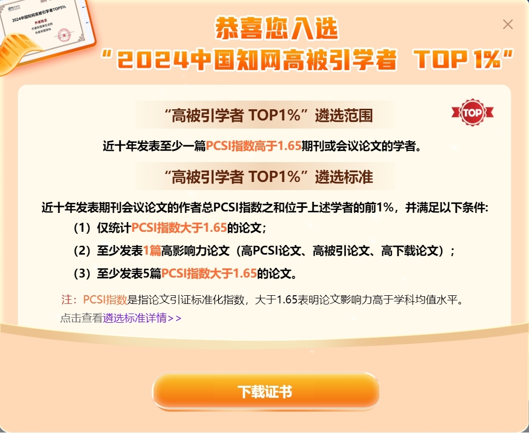 TOP1%学者需满足:作者总PCSI位于全国前1%(基线值31.016),且近十年发表PCSI高于1.65的论文不少于5篇,并至少发表1篇高影响力论文。