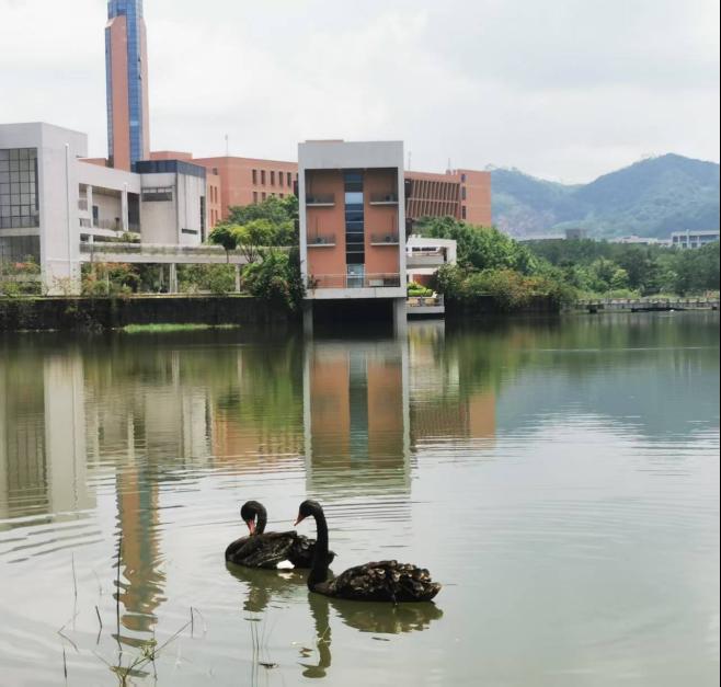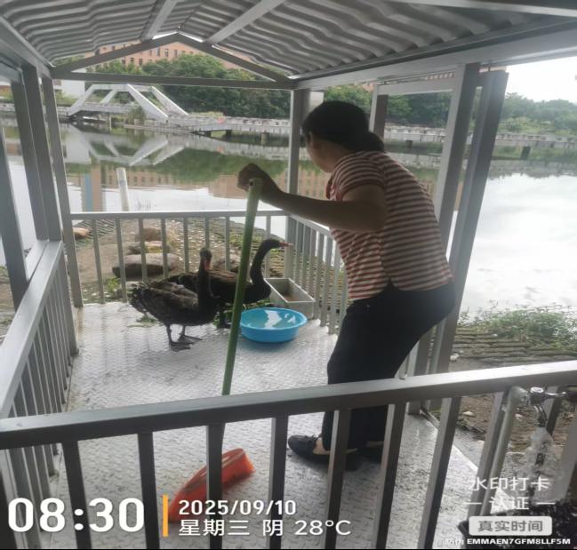 为迎接这对象征“鸿鹄之志”与吉祥美好的黑天鹅,学校资产后勤处做好了充分准备,不仅专门为其打造了干净舒适的“新家”,还专门组织物业团队学习饲养管理知识,从饲料配比到健康监测悉心照料,助力它们适应新家园。黑天鹅的到来,既为校园增添了生机与诗意,也承载着学校对学子尤其是2025级新生的美好期许。晨曦夕阳中,它们与湖光相映成画,映衬出和谐校园、文明校园、绿色校园建设的丰硕成果,也成为校园中一道动人的自然与文化风景。
