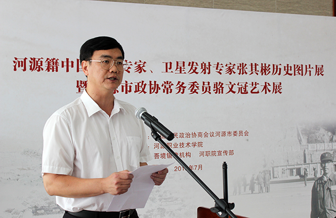 7月15日,由河源市政协主办、河职院承办的《河源籍中国导弹专家、卫星发射专家张其彬历史图片展暨河源市政协常务委员骆文冠艺术展》在我校学术交流中心举行了隆重的揭展仪式,展出记录河源籍中国导弹专家、卫星发射专家张其彬传奇人生的精彩图片及河源籍国家一级美术师骆文冠的部分代表作品。市政协主席龚佐林带队出席仪式。