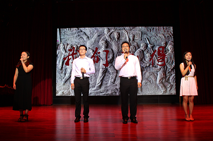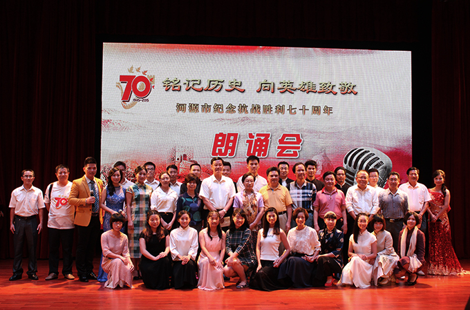 2015年8月30日晚19:30,河源市纪念抗战胜利70周年朗诵晚会——“铭记历史•向英雄致敬”在我校艺术楼演播厅隆重举行。河源市政协龚佐林主席、高仁泽副主席、叶振云秘书长,我校党委段邦贤书记、赖小景副校长及市文联、部分县区领导一同出席观看。