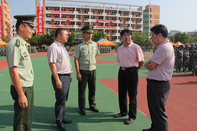 学工处相关负责人向校长刘安华、副校长陈农心汇报了今年新生军训与入学教育内容、班次、军训教官的食宿等情况;市武警支队军训总指挥向校长刘安华、副校长陈农心介绍了此次军训的科目与进展情况。刘安华校长还与参加军训的新生进行了亲切交谈,向他们详细了解到校后的生活情况,并叮嘱同学们要严格训练,严格要求,努力锻造,学习军人的优秀品质,力争以饱满的热情完成军训任务,全身心地投入到学习和生活中当去。