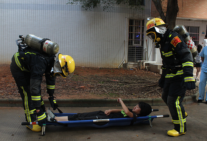 下午16:30,学校报警电话3800110接到学生报警,B区5栋四楼某宿舍发生火警,火势正在蔓延。接报后,学校马上启动了应急预案,拉响了B5栋宿舍楼的消防电铃,向119和学校相关负责人报告火警并迅速组织安保人员赶到现场进行紧急处置,近1000名新生在宿管员等相关人员的的引导下从宿舍楼内紧张、有序地撤离至指定地点,保安员则携带工具进入起火地点进行扑救。十分钟后,河源市公安消防支队文昌中队和源城中队的四辆消防车先后赶到,指挥员马上派出火场侦察人员对火灾现场进行勘察,随即布置消防管道,有序展开灭火行动。正在此时,五楼一宿舍传来呼救声,有几名学生“被困”在宿舍,消防战士们迅速向演习总指挥汇报,在了解了火灾位置与被困人数等基本情况后,消防战士立即冲进“火场”用担架成功把被困学生救出。二十多分钟后,火势被扑灭,消防实操和紧急疏散演练顺利结束。