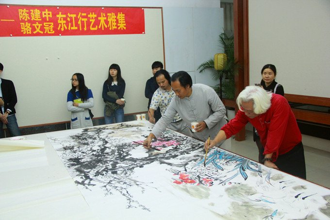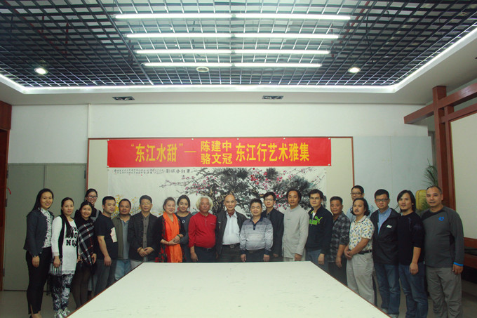 由我校客座教授、龙川籍著名旅法艺术家陈建中,国家一级美术师、深圳美协原主席骆文冠等文艺界人士和部分媒体记者组成的“东江水甜”采风团一行20多人从广东省南部的深圳出发,横跨东莞、惠州、河源、龙川、定南、安远、和平7个市(县),寻访了东江出海口东莞市虎门的威远炮台、惠州西湖、河源万绿湖、龙川佗城、越王井、陈建中老家通衢、霍山、叶绿野旧居、知青部落、江西九曲、三百山东江源头、和平林寨古城等12个景点。采风团的书画家们用别样视角感知沿途风光,品读东江的自然和人文之美,一路即席创作,所到之处墨香四溢,艺彩东江。