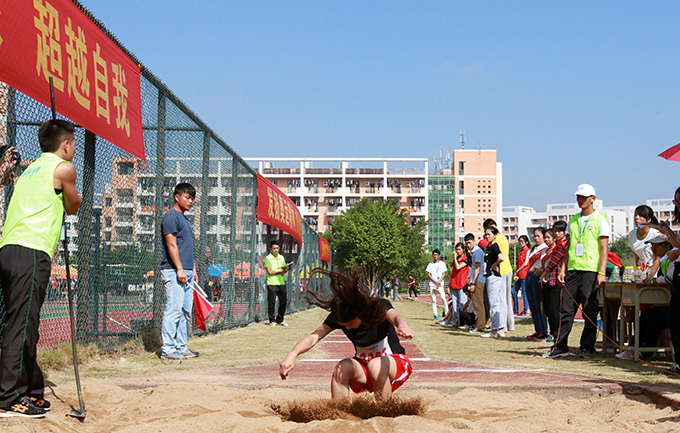 比赛伊始,随着裁判员的到位和选手的一系列准备活动,热身、量步点之后,便开始了选手们之间真正的较量。欧嘉晴的一跳展示出超人的实力,助跑、起跳、腾空、落地,一路一马当先,而其他的选手也不甘示弱,在强大的对手面前越战越勇。经过三轮的激烈的角逐,最终获得前三名的分别是以4.37米的成绩获得冠军的工商学院欧嘉晴,以4.18米的成绩获得亚军的人文学院张巧茹和以4.16米的成绩获得季军的工商学院陈裕玉。
