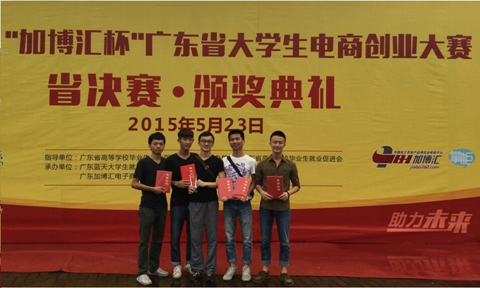2015年5月23日,“加博汇杯”广东省大学生电商创业大赛省决赛暨颁奖典礼在广东外语外贸大学大学城校区大会堂举行,我校由谢叶环老师指导的“全家桶”团队(吴志辉等5位同学),喜获团队销售业绩铜奖。