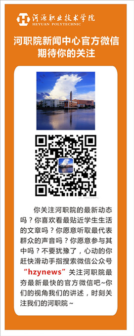 近日,我校新闻中心微信公众订阅号(hzynews)正式上线,该公众号主要发布学校新闻动态、公告通知、学生社团活动等师生关注的热点话题,力争打造一个平等、互动,以原创为亮点、以服务校内师生为目的的平台。打开手机微信搜索“hzynews”或者扫描下方二维码即可关注!