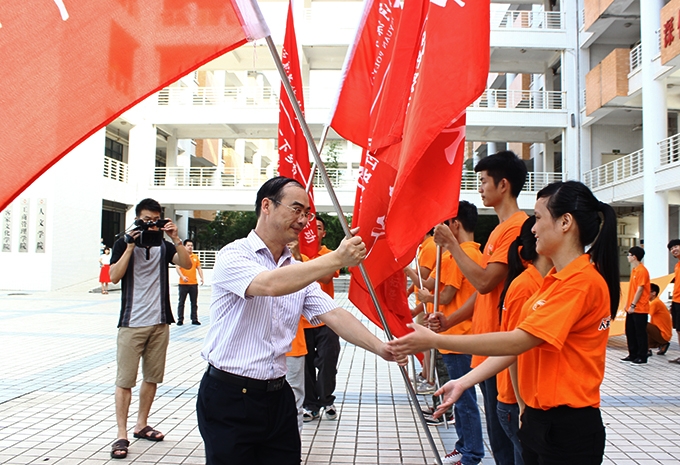 7月13日上午7点半,我校2014年大学生暑期“三下乡”实践活动启动仪式在教学楼中庭举行。副校长赖小景为各服务队授队旗并宣布“三下乡”社会实践活动正式开始。