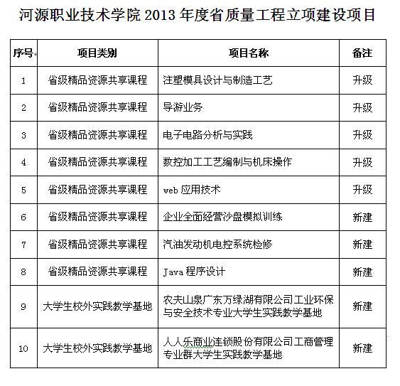 近日,广东省教育厅发布《关于公布2013年度广东省高等学校质量工程高职类立项建设项目的通知》(粤教高函[2014]72号),我校获得8个高职教育精品资源共享课建设项目、2个高职教育大学生校外实践教学基地建设项目(详见附表)。获准立项后,我校将根据省厅要求,明确精品资源共享课程、大学生校外实践教学基地的建设目标、任务和基本要求,认真做好相关建设工作,保证在两年建设期内高质量地完成课程建设与基地建设。