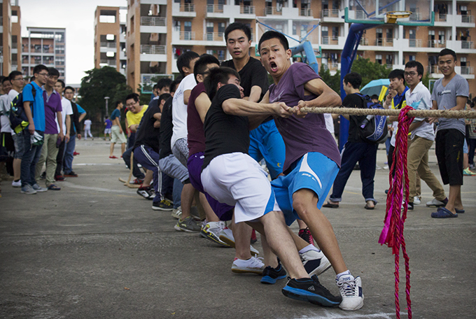 开幕式结束后,由校团委主办、机电学院团总支承办的河职院首届社团拔河比赛在篮球场举行,参加比赛的有学校51个社团以及学生社团联合会共52支队伍,各代表队按照抽签顺序分别进行对决,随着裁判员“滴”一声的哨响,各参赛队开始了紧张激烈的角逐。当天虽然天空不作美还略伴着小雨,可这丝毫没有影响到各参赛队的激情和气势。比赛中,他们全神贯注,使尽全力紧紧地握着手中的麻绳。无论是场上还是场下,气氛都异常紧张,特别是各社团拉拉队那富有节奏感的呐喊声、加油声使选手们充满力量,动力十足。